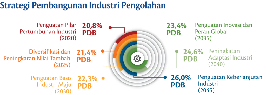 The efficiency of the national industry is increased gradually by implementing smart and sustainable manufacturing. The focus of strengthening the structure of the creative and digital economy in Indonesia until 2045 includes: